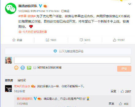 昨天还在讨论苹果微信二选一的问题,个人也感觉微信会大概率妥协,果然昨晚微信做出回应将近期推送最新IOS版本的微信,新版微信将适配IOS13版本的暗黑模式。