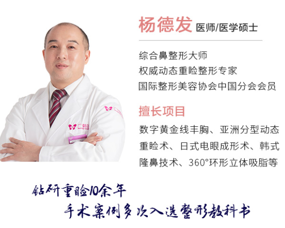 杨德发:著名整形外科专家,中日韩整形技术交流年会中方代表。从事整形美容20余年,手术案例多次入选整形教科书,多次受邀出访日、美、韩、台等国家进行整形美容学术交流,并发表专技论文。整形技术风格以精细见长,他认为每一次整形手术就是一次艺术雕琢,能够巧妙结合美学和医学,用于个性化的手术设计,在国内外实施五官整形手术万余例,求美者满意度颇高。