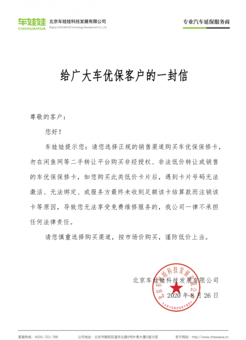 车娃娃提示您:请您选择正规的销售渠道购买车优保保修卡,勿在闲鱼网等二手转让平台购买非经授权、非法低价转让或销售的车优保保修卡,如您购买此类低价卡片后,遇到卡片号码无法激活、无法绑定、或服务方最终未收到足额该卡结算款而注销该卡等原因,导致您无法享受免费维修服务的,我公司一律不承担任何法律责任。请您慎重选择购买渠道,按市场价购买,谨防低价上当。