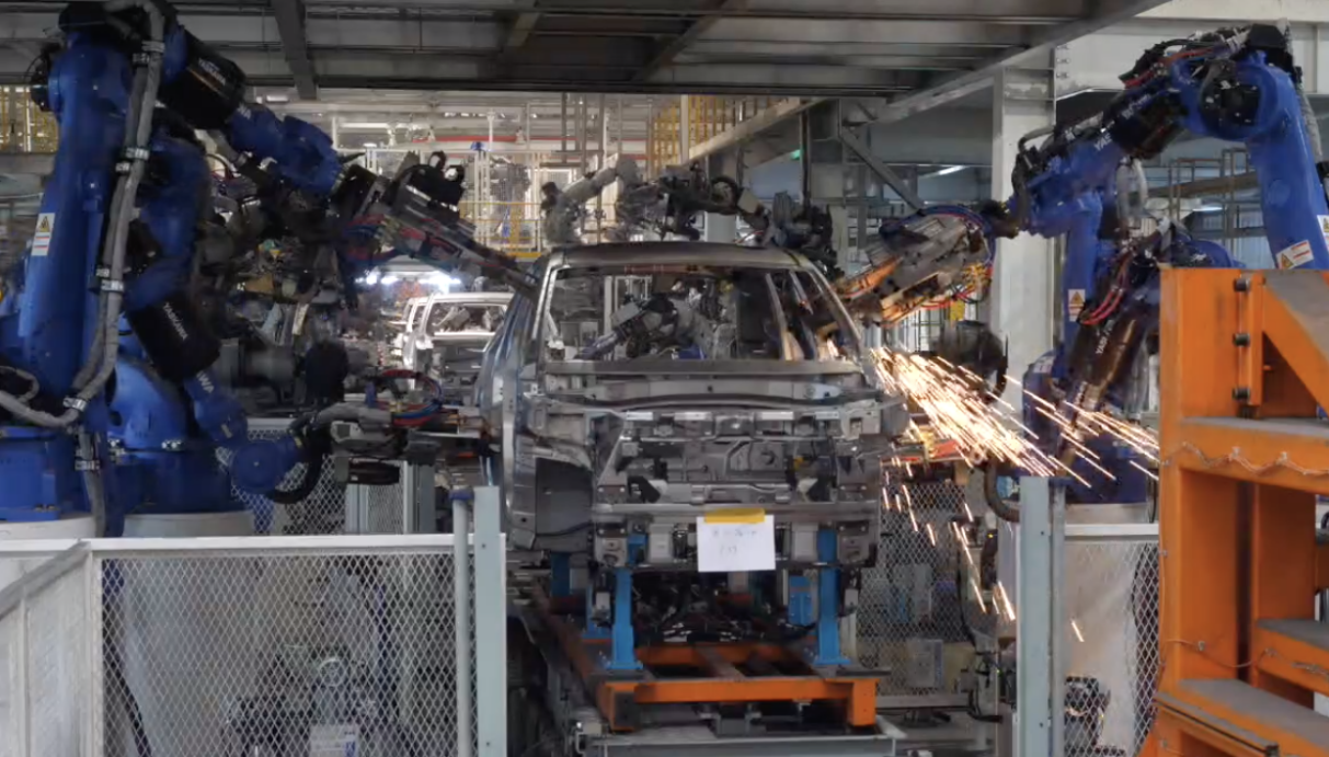 奔腾车间的焊装过程几乎全程由机器人操刀,据工程师介绍,焊装车间共计有300多台焊接机器人,机器人不仅能代替人为操作,更能提升焊接的一致性、稳定性,保证每一个焊点的强度、质量,焊点合格率高达100%。