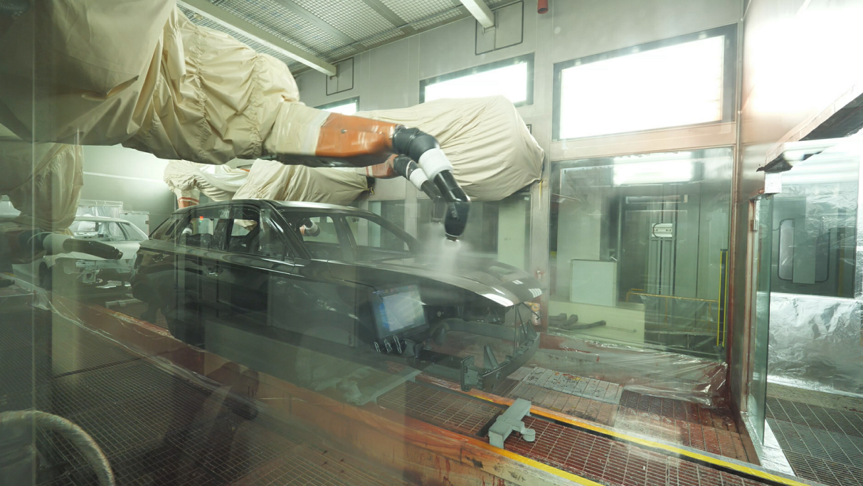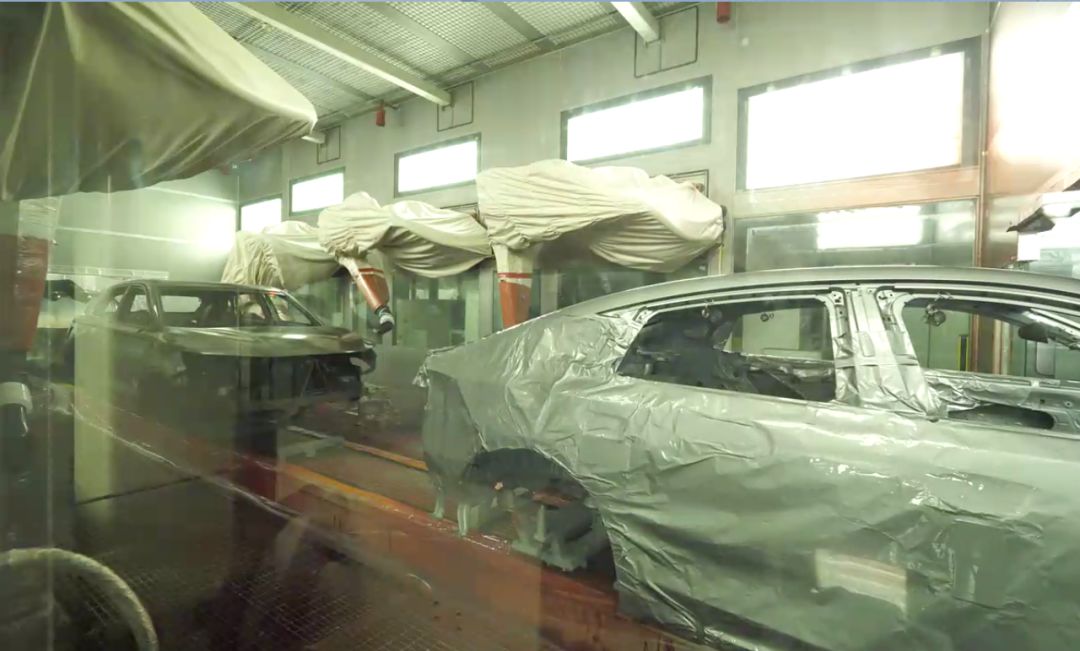 经过冲压、焊装车间后,一台车的基本框架已经完成,这时就要进入涂装车间进行第三个环节—涂装,即对车辆框架进行喷涂,一方面达到美观效果,另一方面保护车身防腐防锈。