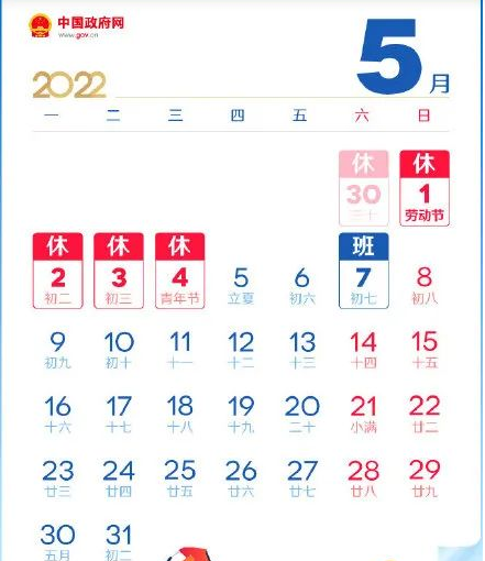 另外,劳动节放假安排为: 4 月 30 日至 5 月 4 日放假调休,共 5 天。 4 月 24 日(星期日)、 5 月 7 日(星期六)上班。