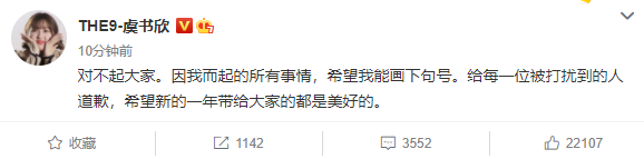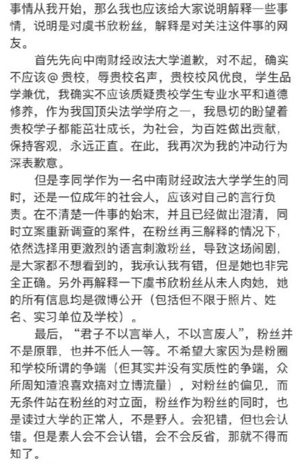 1月13日讯,据悉近日有关媒体报道,一名中南财经政法大学的学生发文吐槽虞书欣是“老赖之女”,被虞书欣粉丝看到后,称该名学生言语污蔑虞书欣,艾特学校官方要求开除她。随后虞书欣就此事发文道歉,称:“对不起大家。因我而起的所有事情,希望我能画下句号。”引发了大家的关注。来源: 凤凰网