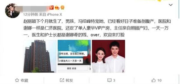 3月1日,据消息报道近日,据知情人士爆料称,赵丽颖3月就要生宝宝了,且怀的是男娃,她与冯绍峰已经选好日子准备剖腹产。据悉,赵丽颖入住的医院是由其闺蜜谢娜介绍的,定了单人豪华VIP产房,费用大概是一天一万左右,并且该医院的安保也做得很好,相对能保护到明星的隐私。