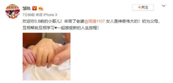 3月8日,据消息报道奥运冠军邹凯发文宣布妻子产子喜讯,称:“欢迎你3.8前的小哥儿!辛苦了老婆@周捷1107?女人是神奇伟大的!初为父母,互相帮助互相学习!一起感受新的人生旅程! ”