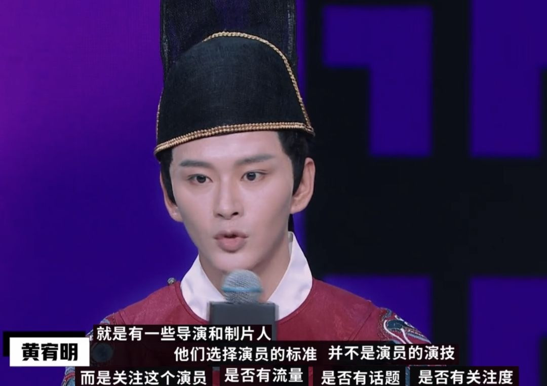 节目中,演员黄宥明在表演结束后发表感慨:娱乐圈有一些很不好的现象,有一些导演和制片人,他们选择演员的标准并不是演员的演技,而是关注这个演员是否有流量、是否有话题、是否有关注度,形成了一种“流量至上演技作配”的导向。