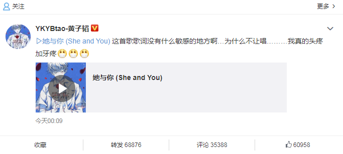 结果,今天就收到黄子韬的灵魂式质疑:明明都演出过了,还拿到了最高收视率,为什么不让唱了,明明歌词也没有敏感的地方呀。