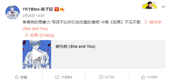 在2月26日时黄子韬发布了他最新 mini Ep。据黄子韬透露,《她与你》这首歌是他自己写的词,还炫耀到:单身狗的想象力,写词不比你们谈恋爱的差吧。