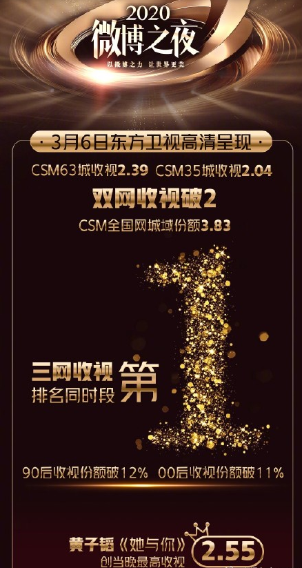 微博之夜的新EP《她与你》首秀也是直接拿下当晚收视最高。