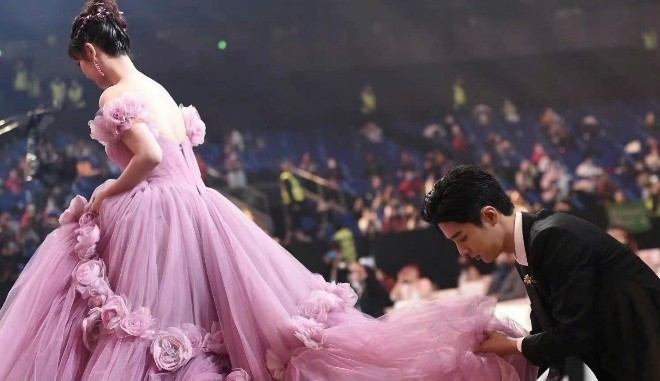 此前,两人也在某平台的活动中同框领奖,杨紫身穿拖地长裙,身材婀娜,而肖战黑色西装很是帅气。共同领奖上楼梯时,肖战为杨紫提起裙摆引起了热议。两人合作后关系亲近,可见一斑。