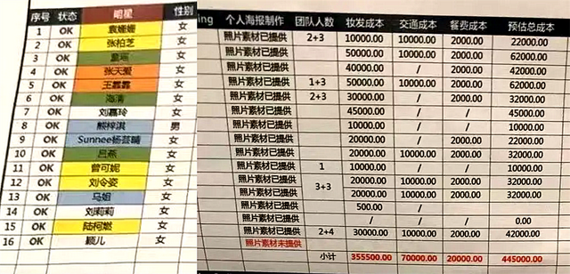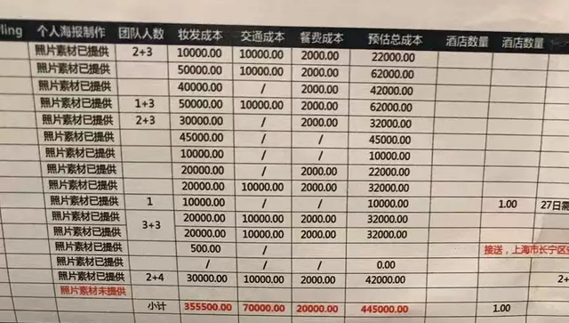 有的艺人还有其他需求,交通费一人1万,餐饮费一人2000。算下来,预估成本最贵的还是那两位女明星,而且张柏芝团队人数空白,等于说,她一个人就需要6.2万。