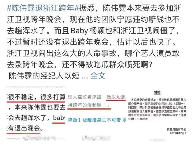 求生欲满满的品牌方,马上出来澄清,说高以翔事件发生之后,就已经取消和浙江卫视的跨年合作了。还在文中称赞公司的行动力,几天前就取消合作了。最后不忘补充一句,这种事情面前必须立场正确。