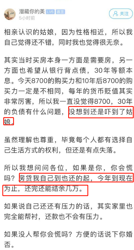 对方嫌弃他背负30年的负债吓到了姑娘。虽然每个人都有选择自己生活方式的权利,但还是有点失落……如果是你你会怎么办?