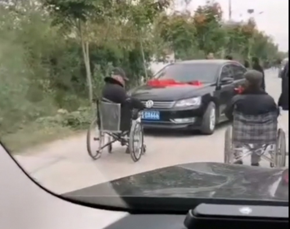 10月10日,安徽亳州网友爆料,亳州某地两名坐轮椅老人在路中央拦婚车要钱。