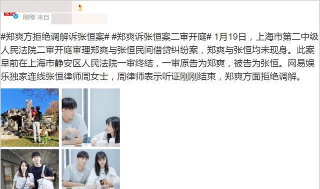 19日上午,郑爽与张恒民间借贷纠纷案在上海市第二中级人民法院二审开庭审理,但郑爽、张恒并未现身。此前,该案在上海市静安区人民法院一审终结,一审原告为郑爽,被告为张恒。有媒体就此事联系张恒律师,对方表示听证刚刚结束,郑爽方面拒绝调解。
