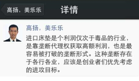 早在8月1日,高扬在朋友圈内发布:“家具业公认的秘密:国内市场上高端进口床垫的利润仅次于毒品,渠道垄断是主要原因,消费者正在被打劫”。
