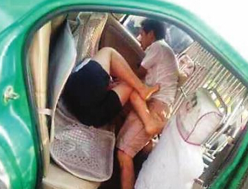 记者从微博上的图片看到,一名女子躺在出租车后排座位上,一名男子正弯腰站在女子身前。女子双脚翘起,顶在男子身上。