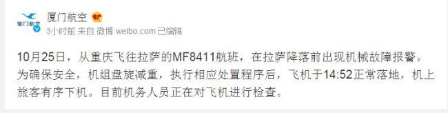 对此,厦门航空于当天下午通报称,从重庆飞往拉萨的MF8411航班,在拉萨降落前出现机械故障报警。据悉,该航班搭载88名旅客和机组人员,从重庆飞往拉萨途中一边襟翼卡阻,且油量不够返航,无法减速,也上升不了高度,只能在拉萨机场降落。