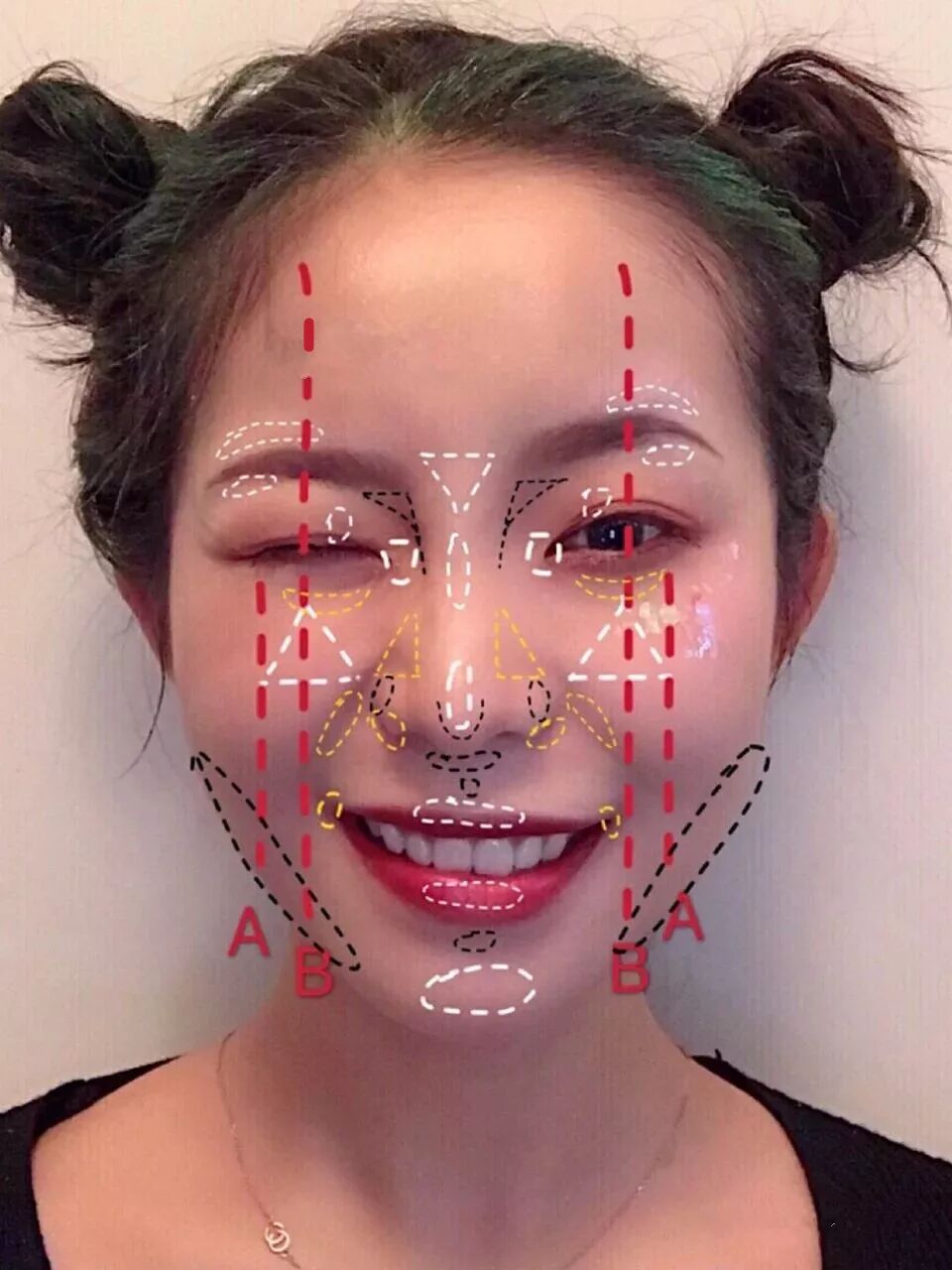 眼下高光三角区:亚洲妹子普遍有面中较低平的问题,一般大家都会把高光打在A线中部苹果肌处,但其实面中高光应该在B线上,并且要提高至眼下,因为面中低平一般是眼下三角区较扁平,而苹果肌处因为本身就会比较peng,且通常会用腮红修饰,所以高光打在三角区更能修饰亚洲人的面中问题,