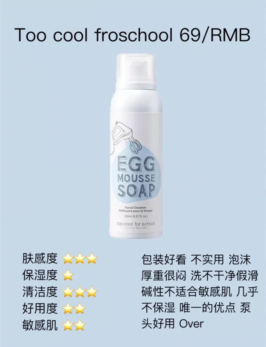 鸡蛋慕斯洗面奶,我洗了几次就闲置了,因为总感觉脸洗不干净,有假滑,擦干后脸又好干,是碱性的 干皮和敏感肌们就不要尝试了。