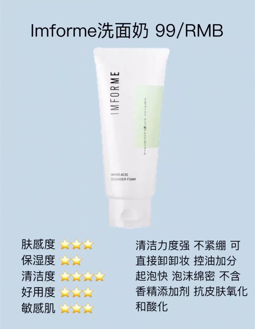 经典的入门级氨基酸洗面奶,用手就能打出泡沫来,但是说实话它的清洁力太强了,不适合干皮和敏感肌,相对来说适合皮肤糙一点的油皮、混合肌,还有就是味道好奇怪