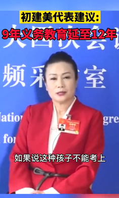 人大代表初建美原话为:“关于未成年人义务教育完成后继续教育的建议,九年义务教育完成后继续完成义务教育,也就是说九年义务教育延长到十二年,如果说这种孩子不能考上高中话,可以进入职业学校,项包括这个政府工作报告已经提出了,对于这个职业学校加大力度的政策上的扶持。我就觉得非常好,让孩子学一门技术,将来好回报社会。” 来源:新闻娱乐