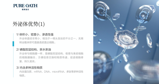 在护肤领域,想要获得真正的口碑、实效,它意味着技术的绝对领先和真金白金的投入。其中,研发出的核心原料,便是其根本。理肤宣言旗下产品的核心成分为外泌体。外泌体被科学家称为21世纪以来突破再生和修复技术瓶颈的明星成分,妥妥的“护肤黑科技”。它可以穿透表皮层直达细胞,而且因为它是天然磷脂双层结构,与细胞膜的结构一样,可快速和细胞融合,进入细胞内部释放活性物质,进行衰老、受损细胞的激活、修复和滋养。