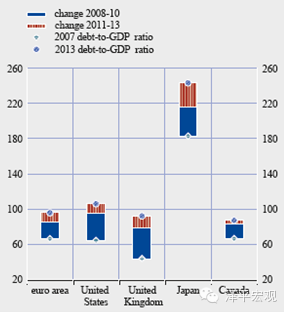 欧元区债务不算高。与美国和英国相比,欧元区政府预算赤字占GDP的比重低。2013年的预算赤字占GDP的比重仅为0.5%。