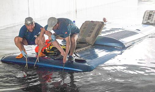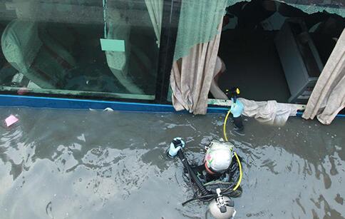 为了救出被困车辆,郑州市红十字水上义务救援队赶赴现场,救援队队员坐着气垫船,载着专业的潜水员,潜入下水帮助寻找车辆的拖车挂钩,最终车辆被拖离水域,向北拖到隧道口处,车轮着地后,用拖车把大巴车拖出来!赶紧送到了维修厂。