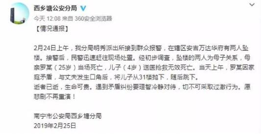 2月26日,据消息报道24日上午,西乡塘公安分局明秀派出所接到群众报警,在辖区安吉万达华府有两人坠楼。接警后,民警迅速赶往现场处置。经初步调查,坠楼的两人为母子关系,母亲罗某(25岁)当场死亡,儿子(4岁)送医抢救无效死亡。当天上午,罗某因家庭矛盾,与丈夫发生口角后,将儿子从31楼抛下,随后跳下。