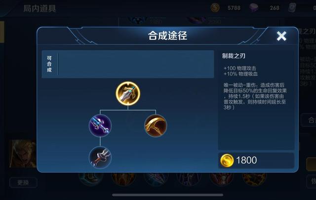 针对一个坦克,又要针对敌方的快速回复,还要增加自己的吸血能力,就只有一件装备符合标准了,那就是制裁!制裁能够提供100点攻击力,还有10%的吸血能力,这就保证了续航能力,最核心的还是它的被动,能够给敌人造成3秒的重伤效果,非常针对程咬金或者曹操这类回复能力极强的英雄,没有制裁可以说根本无法击败他们,只有制裁能够完美压制程咬金,泣血之刃也是比不了制裁的效果!