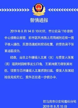 8月15日凌晨,河南驻马店市公安局雪松分局发布通报称,2019年8月14日10时许,市公安局110指挥中心接群众报警,称市区风光路上海商城附近有一男子被人捅伤。民警迅速赶到现场处置,将受伤男子张某送医救治。
