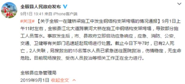 安徽网大皖客户端讯据美好滁州,9月1日上午11时左右,全椒县江北大道跨襄河大桥在施工中钢结构支架垮塌,导致部分施工人员落水。事故发生后,市、县政府立即启动应急响应,应急、消防、公安、交通、卫健等有关部门迅速赶赴现场进行处置。截止今日下午7时,已有2人死亡,2人失联,另搜救出的15名落水人员已紧急送往医院救治,伤情稳定,无生命危险。目前现场搜救、受伤人员救治等相关工作正在全力进行。