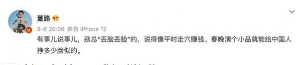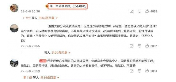 就因巩汉林的这一段话,不仅招来了前国足队长冯潇霆的暗讽,就连某自称很懂足球的专业人士也来讽刺:有事儿说事儿,别总“丢脸丢脸”的,说得像平时走穴赚钱、春晚演个小品就能给中国人挣多少脸似的。