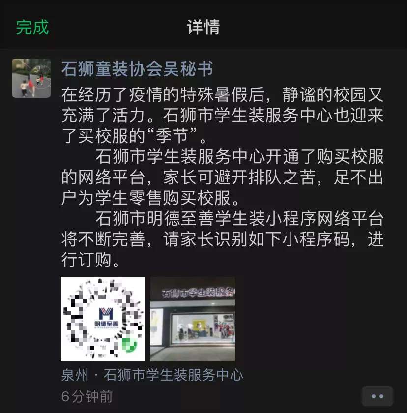 今年,在石狮童装协会的组织下,石狮市学生装服务中心开通了校服购买线上渠道,号召全市公立学校家长通过“石狮学生装”小程序商城进行校服订购。