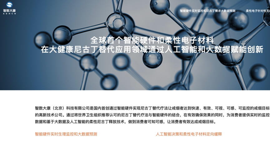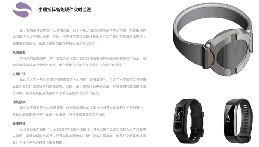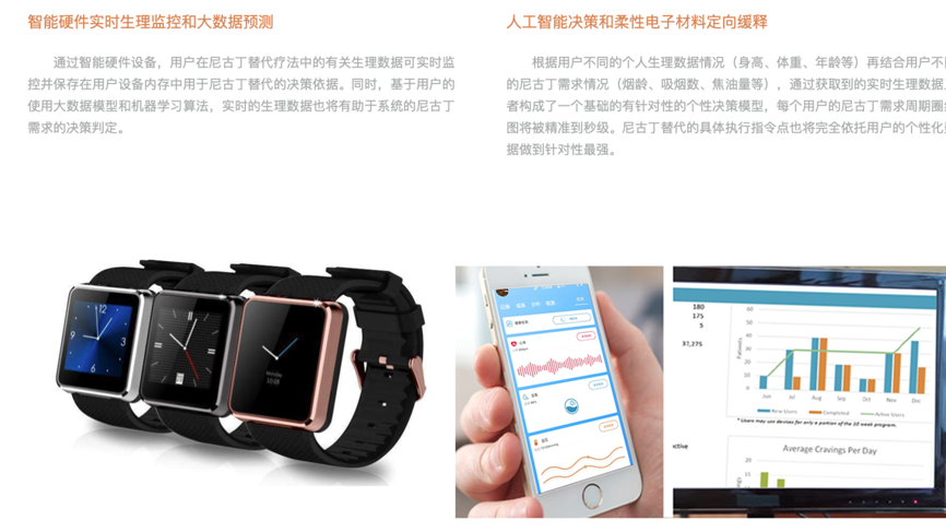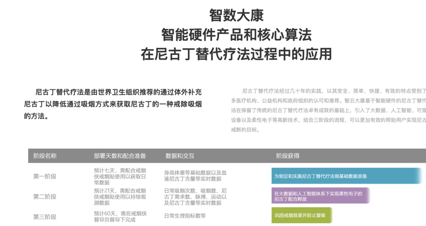 基于戒烟侠的督导服务体系,智数大康将在此基础上通过智能硬件实时监测和机器学习应用、大数据和人工智能预测算法和模型迭代以及柔性电子定向渗透和释放三大核心技术为戒烟用户打造一整套可知可感可见尼古丁替代疗法应用体系,从而更加有效帮助中高端戒烟用户实现快速快捷低复吸的戒烟和控烟解决方案。
