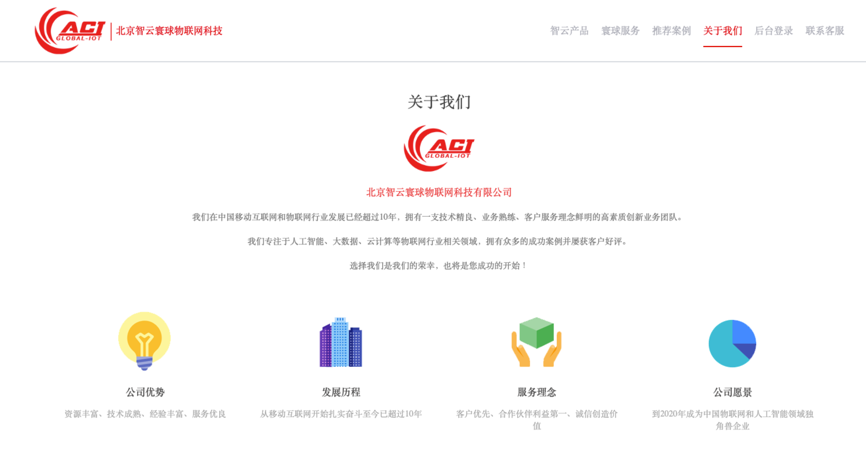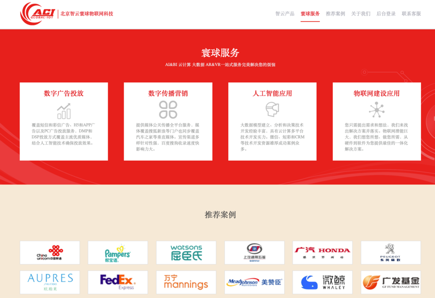 北京智云寰球物联网科技有限公司以中国物联网发展为基,以做合作方最亲密的伙伴为荣,以为合作伙伴创造价值为傲!公司专注大数据、人工智能和云计算等物联网应用领域的品牌客户需求应用和发展,在业务中积极协调多方资源同心协力为众多国际知名品牌提供一流的营销支持和数据服务,在品牌客户圈具有良好的口碑。依托运营商数据资源和业务拓展支持将品牌客户基于大数据、人工智能和云计算的营销管理需求进行创新性结合,与众多知名4A和公关公司形成了良好的合作伙伴关系。