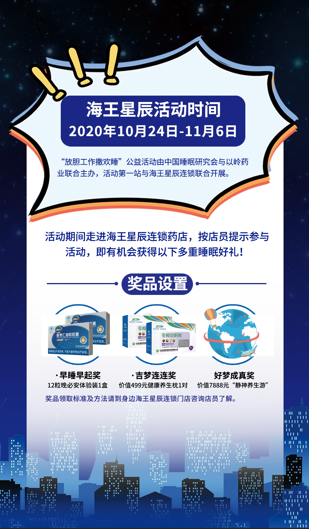 10月24日到11月6日期间为第一期活动,人们只要走进海王星辰连锁药店,扫描二维码参与活动,就有机会获得多重睡眠好礼。同时活动也会通过微信、抖音、微博等时下最流行的线上媒体,邀请专家开展睡眠知识科普直播,让更多的人享受健康睡眠。