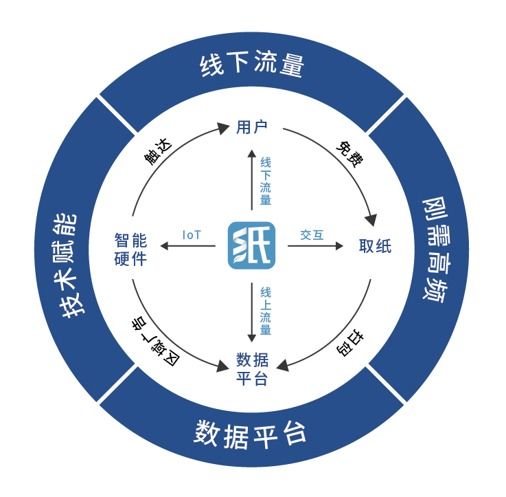 纸巾宝基于智能硬件为入口,通过智慧供纸解决方案快速获取线下精准流量,再通过大数据和智能算法深度挖掘数据的价值,将流量赋能给周边的商家,实现商家、用户多方共赢,是国内领先的区域化精准大数据智能营销平台。