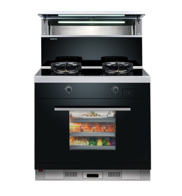 集成灶把油烟机、灶具、蒸箱、储藏柜、消毒柜等多种功能集合在一起,具有油烟吸净率高、节能环保、超静音及显示直观等特点,不仅节省了空间、费用还简化了人力操作程序。
