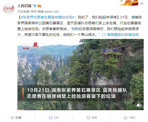 21日,湖南张家界国家森林公园黄石寨景区,蓝天救援队志愿者们系上安全绳,行走在悬崖绝壁上捡拾垃圾。志愿者秦新高说,“你扔垃圾是很简单的,我们想捡起来难度很大,希望大家不要乱扔垃圾,给我们一个青山绿水。”来源于腾讯新闻网。